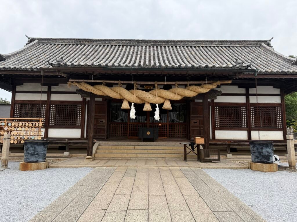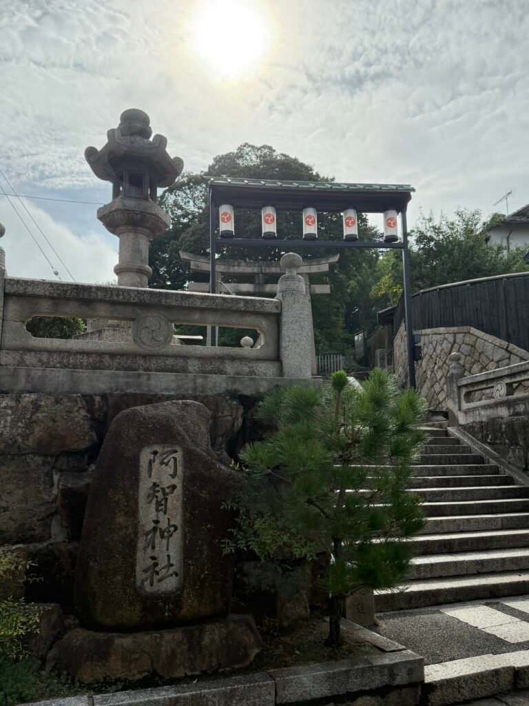回到美觀地區,往鶴形山上走去,來到歷史悠久的阿智神社。這座神社的主祭神是宗像三女神,被視為倉敷的守護神。雖然要爬上一段石階,但走到境內後,立刻能感受到一股寧靜感,和熱鬧的街區完全不同。