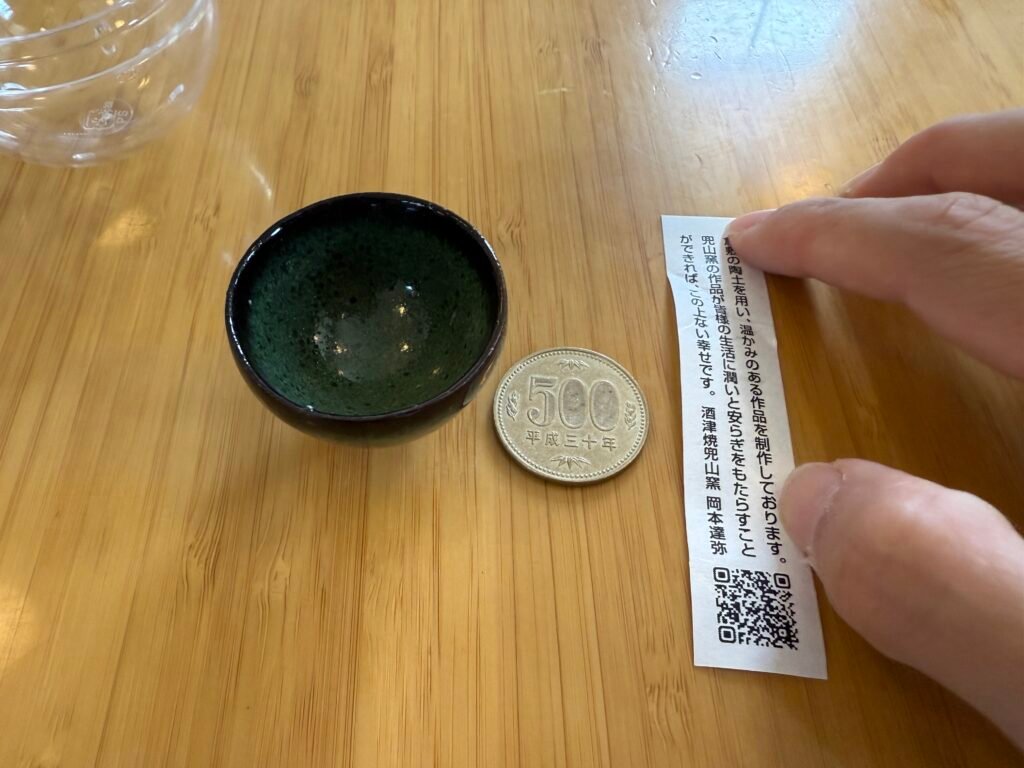 傍晚回到河畔,我們稍微提早到了便在遊客中心等待遊船的時間,等待的時候發現案內所裡面有可愛的兜山窯燒迷你酒杯扭蛋,馬上決定要扭兩個回去送給大姐和姊夫用來喝我們今天在倉敷買的清酒,用這個杯子我也能一口乾杯了~