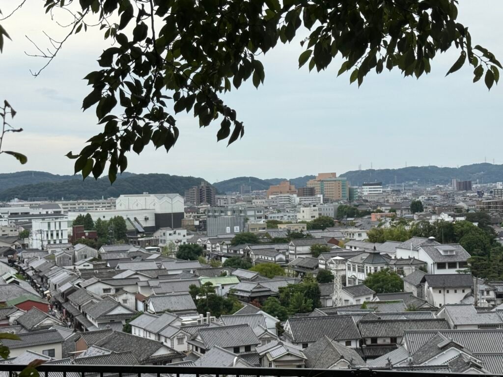 從神社俯瞰整個美觀地區,視野非常開闊,白牆黑瓦的街道與河岸盡收眼底。