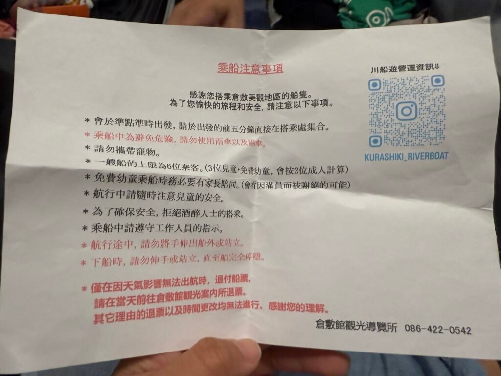 購買完船票後會拿到乘船注意事項,記得在購買的時段前五分鐘到乘船處集合,乘船處就在案內所對岸從門口的那座橋過去後右轉沒多遠就是了。