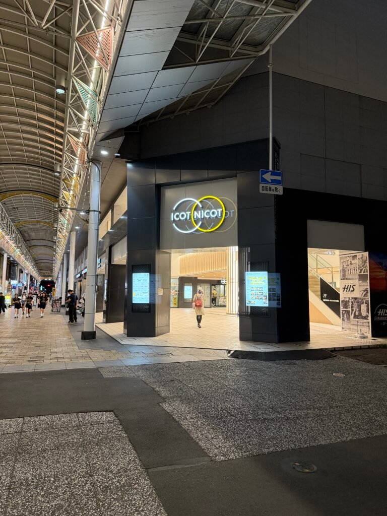 擔心地下街太複雜迷路所以我們選擇直接出一樓,過馬路朝著岡山駛前商店街進去走大約一個街區就會看到ICOT NICOT 商場的Logo,飯店就在這棟大樓6樓,一樓就有很多餐廳可以選擇。