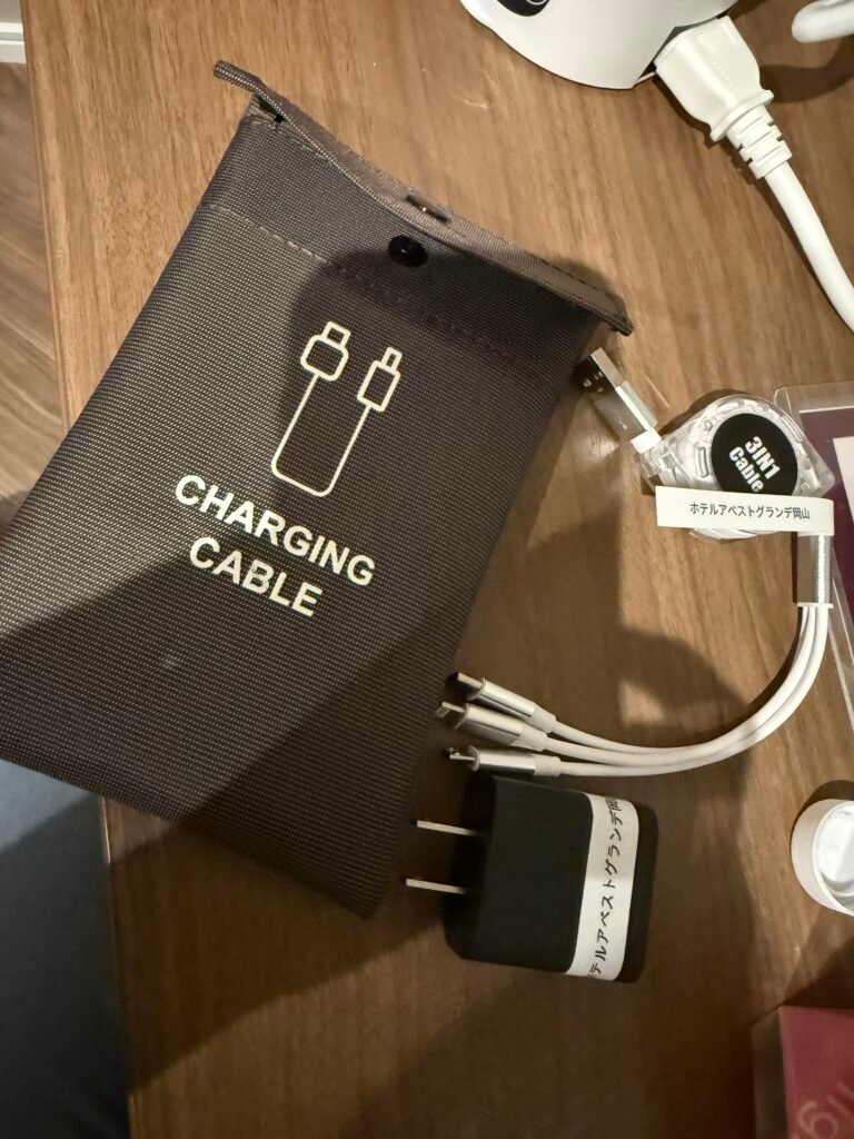 飯店很貼心的提供了各種手機可能會使用到的充電線,一轉三有Type-C、iphone Lightning、micro USB,萬一忘記帶也不擔心,但這是不能帶走的喔記得退房要留下。