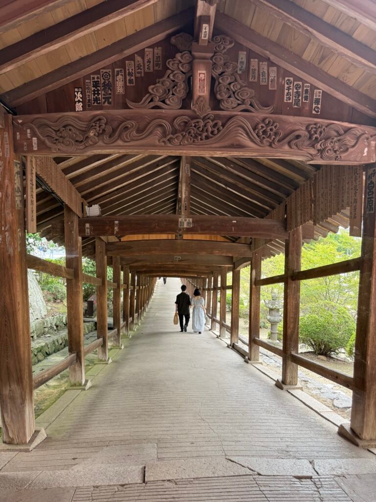 御手洗旁的階梯上去便是主殿,旁邊則是吉備津神社著名的長迴廊往前可以走滿遠的但沒有繞一圈要再原路走回神社,參觀完吉備津神社後看了一下電車時間發現剛好錯過了一班,原本只有打算來吉備津神社的我們就決定散步到吉備津彥神社看看順便到下一站搭車。