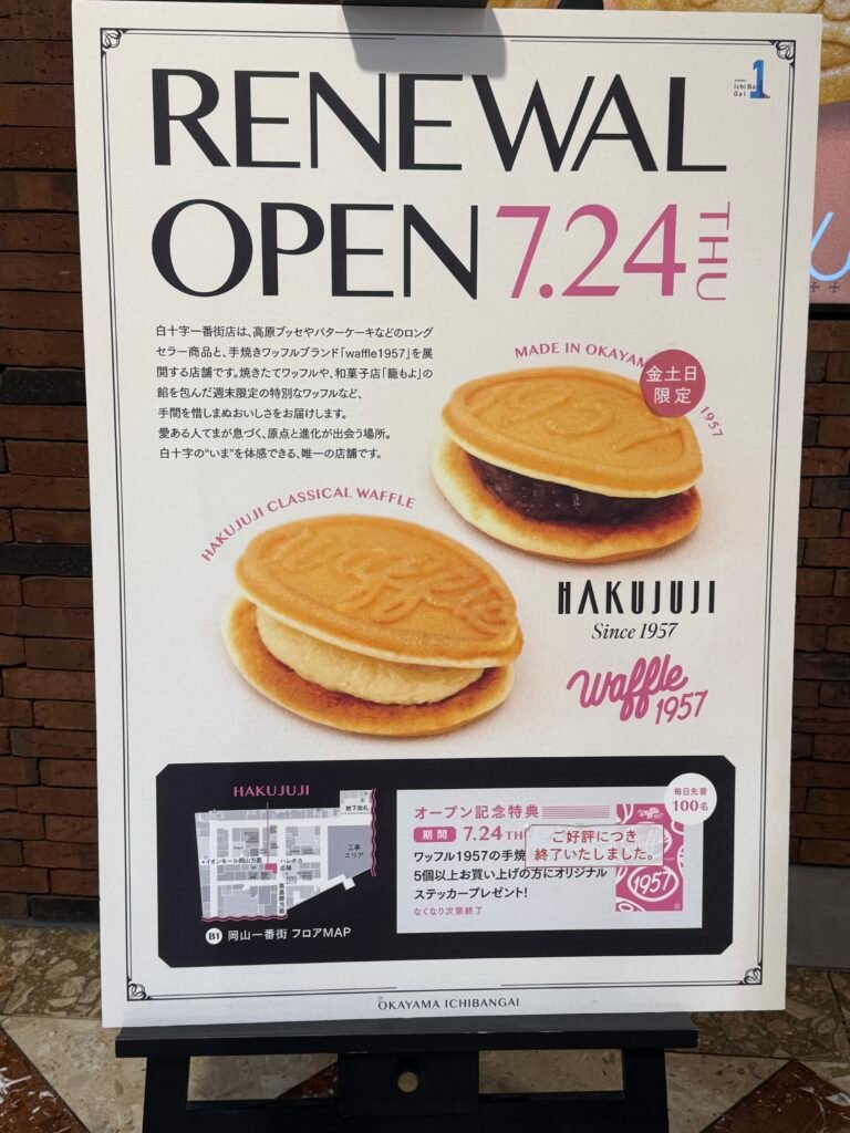 離開神社後我們回到岡山車站,因為正好是中午時分所以決定走車站下方的地下街逛逛順路到高島屋買東西再前往昨天晚上經過看到門口在排隊的お好み焼 花門S 吃午餐。地下街的商店很多,在等SABON店員包裝的同時發現不遠處轉角有間華夫餅很多人就順便買來吃。