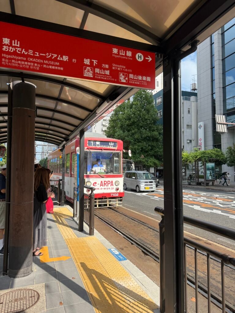 路面電車站有兩個上車的位置紅色的東山線就可以前往岡山後樂園了