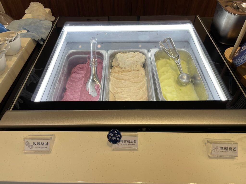 根據店員介紹店裡每天的冰淇淋口味都會有所不同,我們去的當天遇到了八種口味,分別是年輕真芒、椰有花生醬、純椰子冰淇淋、玫瑰洛神、開心果、牛奶、草莓、花椒巧克力。