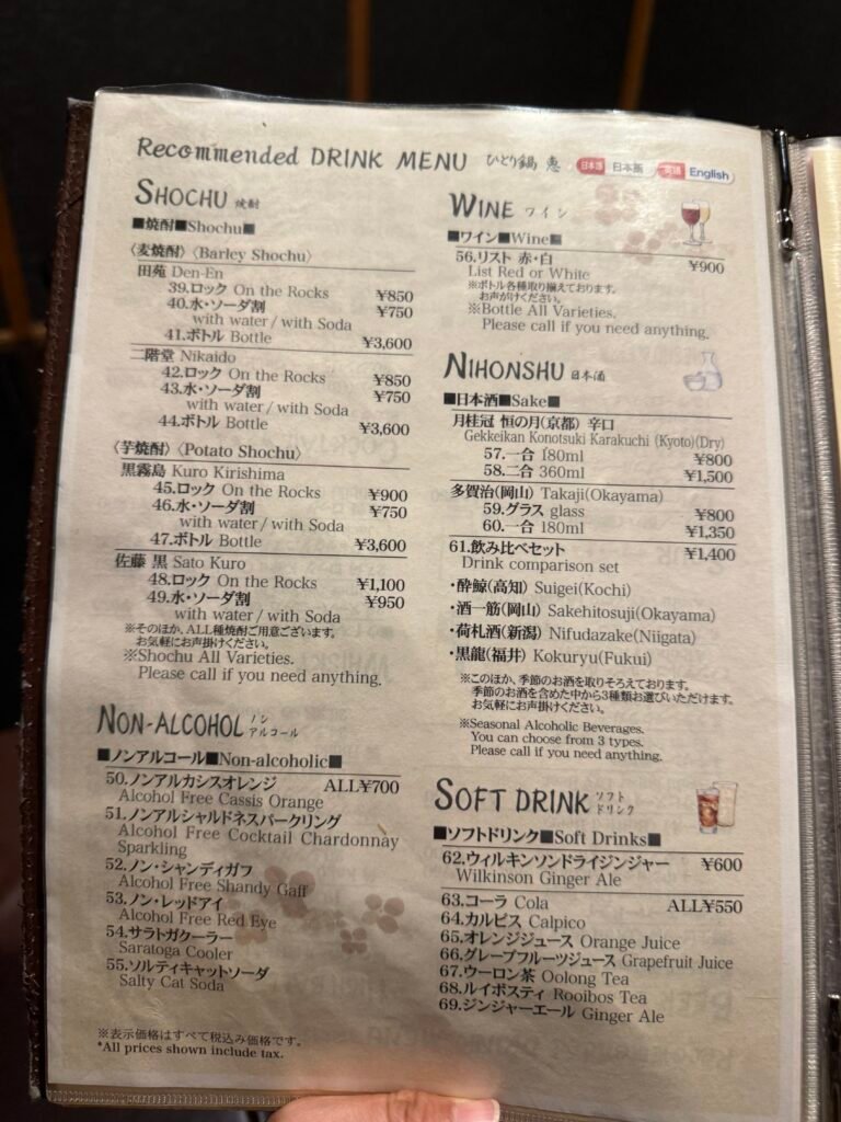 店裡菜單有中英日版本,有看到網友分享如果是平日午餐來可以選很划算的商業套餐,可惜我們吃的是晚餐時段。鍋的部分可以選擇涮涮鍋(しゃぶしゃぶ) 或壽喜燒(すき焼き)我們都選了壽喜燒,選白飯的話最後店員還有幫我們煮成粥。