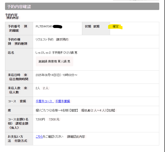 填完資料送出後會先收到一封標題是【まだ予約は確定していません】的信,我隔天才收到[楽天ぐるなび]ご予約が確定しました 確認訂位成功的信,系統狀態也會顯示為確定