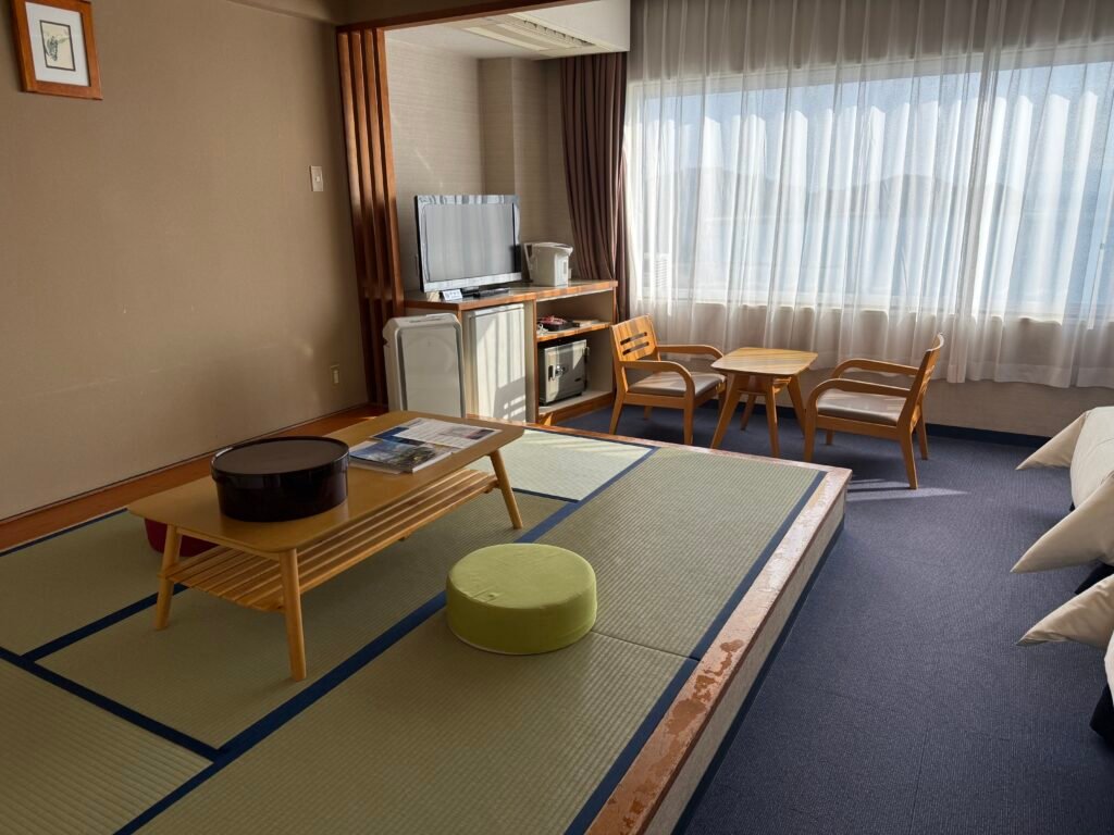房間很大,可以坐在窗邊的桌椅欣賞海景,也可以在和式小客廳泡泡茶
