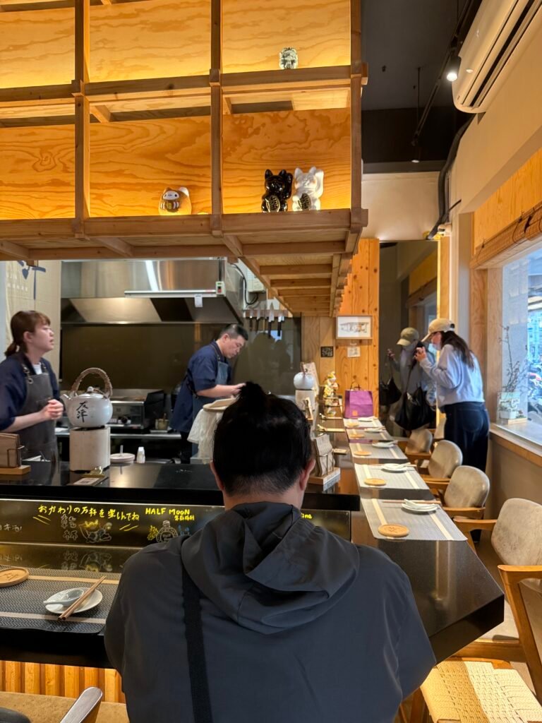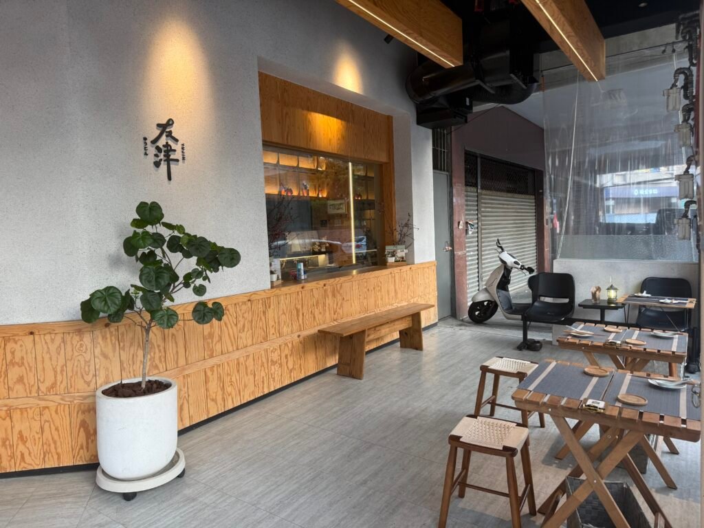 這次因為我們臨時才訂的位因此沒有坐到室內區,而是入座了戶外騎樓的座位。在微涼的天氣裡,坐在騎樓下看著巷弄裡的光影與來往的行人,反而多了一種在日本街頭吃路邊屋台或在地居酒屋的愜意放鬆感。店裡不接待 6 歲以下的孩童,加上巷弄本就寧靜,整體氛圍非常舒服。