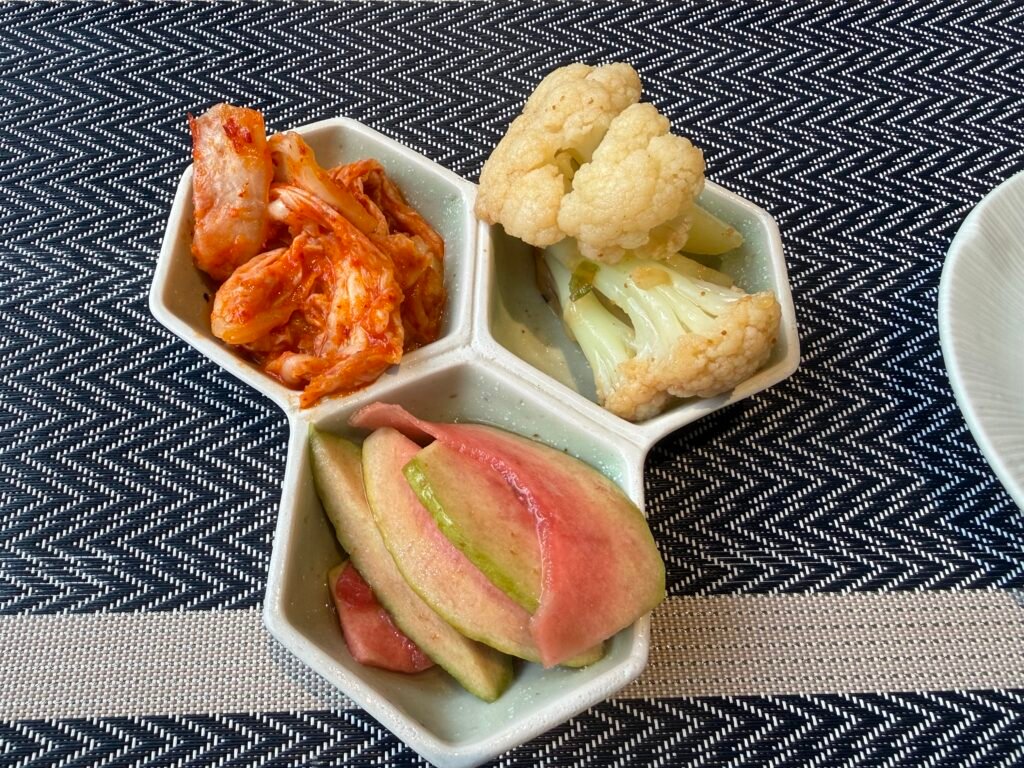 除了主角丼飯表現亮眼,附餐的細節也完全不馬虎。隨餐附上的珍味三品涼拌小菜,口感清爽解膩,剛好平衡了燒肉的濃郁。最棒的是那壺可以無限續加的豚骨雞湯,湯頭溫潤醇厚,裡面還有些蔬菜的輕甜,在微風徐徐的戶外座位喝上一碗熱湯,整個胃都暖了起來。