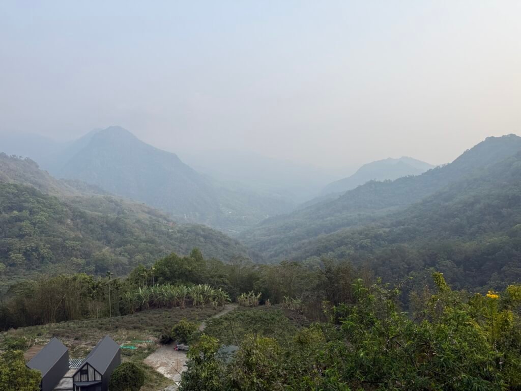 車子沿著蜿蜒的台18線阿里山公路行駛,再轉進前往達娜伊谷的方向,一到游芭絲的門口,一眼就被那個超霸氣的原木柴燒烤爐給吸引!工作人員已經在準備食物了,烤網上鋪滿了厚實的鄒族烤肉和山地大香腸,底下是用真正的原木生火慢烤,油脂滴在木炭上發出滋滋的聲響,原本還擔心訂五點太早了,但一聞到食物的香氣,真的會讓人瞬間飢腸轆轆。餐廳的座位區是半戶外的木造觀景台設計,放眼望去就是壯闊的翠綠山谷。徐徐的微風吹來,樂樂開心地在位子旁享受著這份屬於高山的清涼。