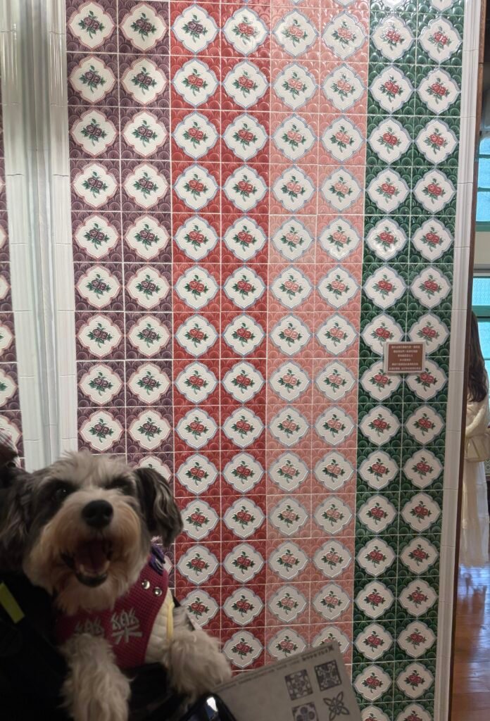 帶狗狗出遊,最怕遇到突然想看展卻被拒於門外的窘境。幸好,花磚博物館是一間寵物友善的藝文空間!館方的規定非常明確且貼心:寵物可入館,但請勿直接落地,需放置於推車、提籠或抱在懷中。這對我們來說完全不是問題,因為館場是屬於老式透天有兩層樓和一個小閣樓,所以為了參觀方便我們用外出背包背著樂樂,就能一起暢遊這座美麗的博物館。看著樂樂從背包探出小腦袋,好奇地四處張望那些色彩鮮豔的花磚還似乎一起認真地聽導覽,畫面真的超級可愛,也讓我們能毫無壓力地細細品味這些歷史藝術。