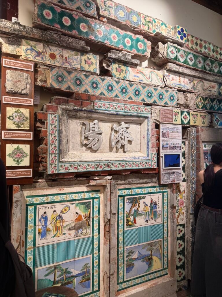 為了保護這棟擁有接近百年歷史的珍貴木造老屋,入內參觀是必須脫鞋的喔!踩在溫潤的檜木地板上,伴隨著淡淡的木頭香氣,抬頭一看,滿牆、滿地都是色彩斑斕、圖案各異的復古老花磚。這些原本鑲嵌在傳統古厝屋頂或牆面上的花磚,每一片都承載著曾經的家族故事與祝福,被志工們一塊塊搶救下來,集中在這裡綻放著歲月的迷人光彩。